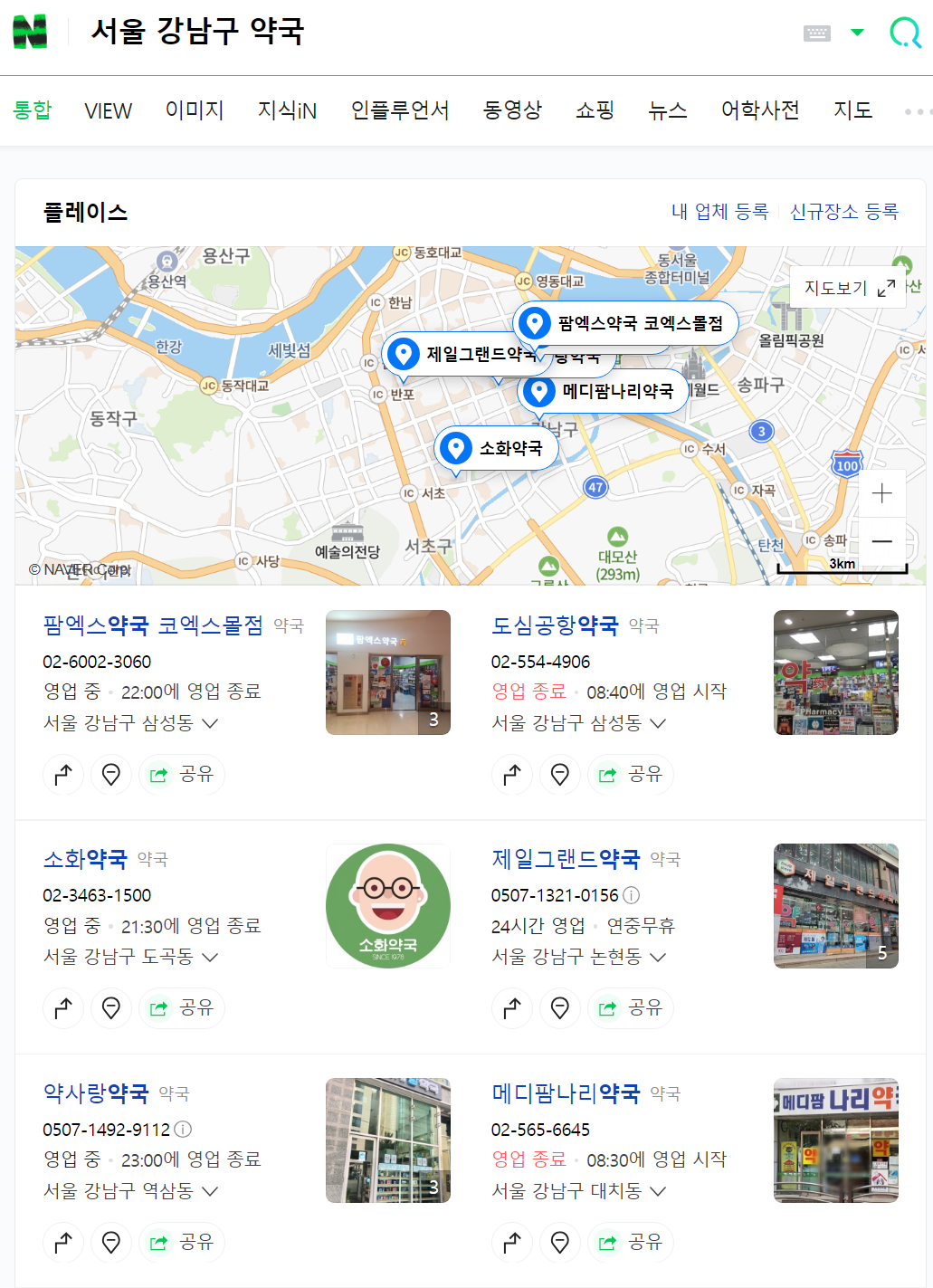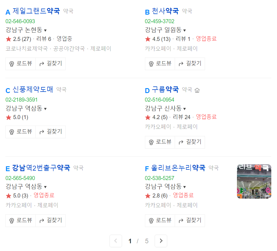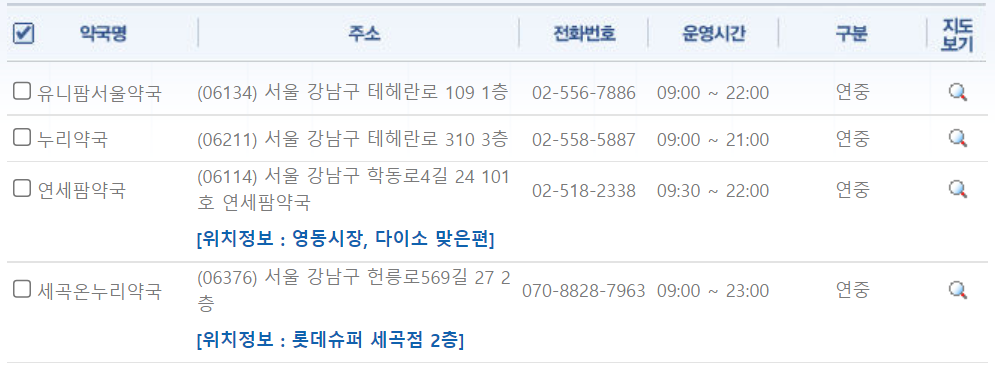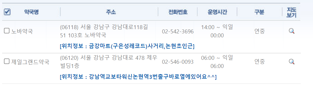 다음이나 네이버 사이트에서 '서울 강남구 약국'을 검색