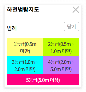 만약 등급이 5등급(빨간색), 4등급(보라색) 일 경우 침수 확률이 높은 곳이므로 시청에 배수펌프장 설치요청을 하고